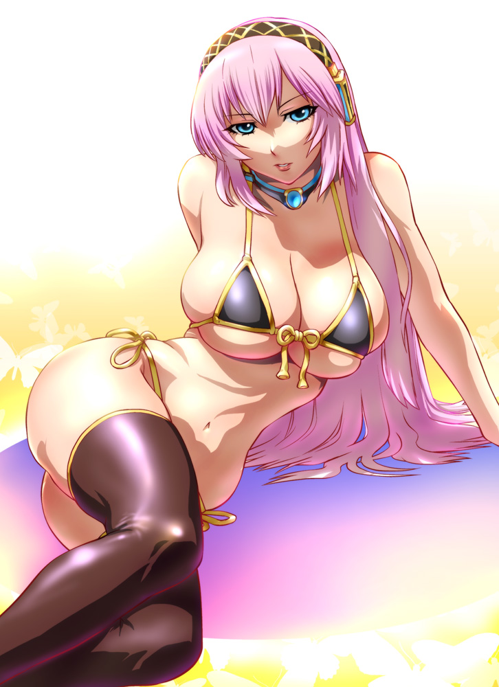 1girlsarm supportbikiniblue eyesbreastsFlag for Deletionfront-tie tophuge breastsjewelrylong hairnecklaceon sidepink hairshinyside-tie bikiniskindentationsoloswimsuitthighhighsvocaloid