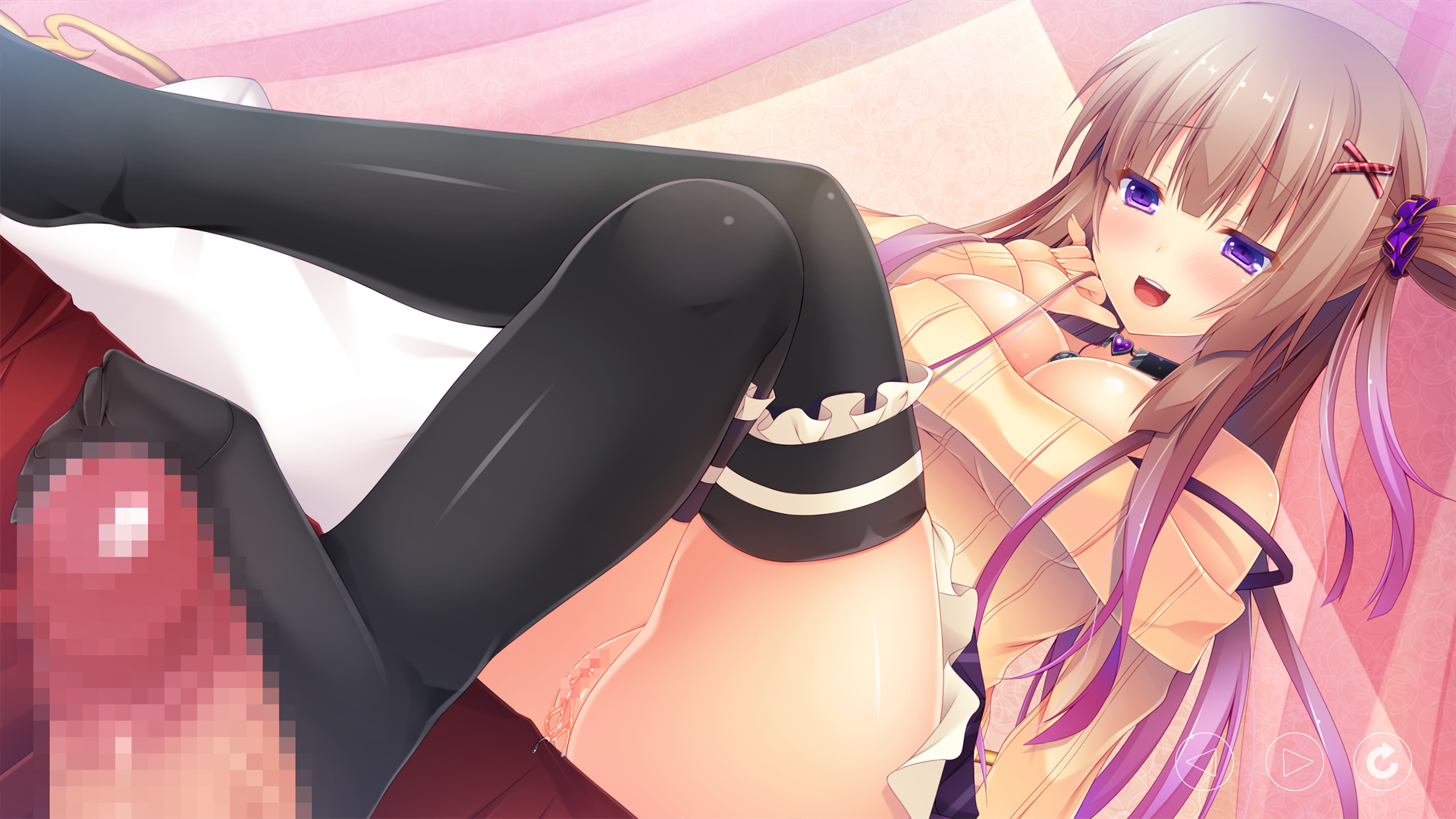 bare shouldersblack legwearblushbrown hairchokercleavageFlag for Deletionfootjobfrom belowgradient hairintegral (company)kami-sama no mimi wa kemonomimi!?kuzuha (kami-sama no mimi wa kemonomimi!?)legs crossedlong hairmulticolored hairno pantiesopen mouthpenispink hairpurple eyespussyscrunchieside ponytailsittingskirtstrap slipsweaterthighhighsupskirt
