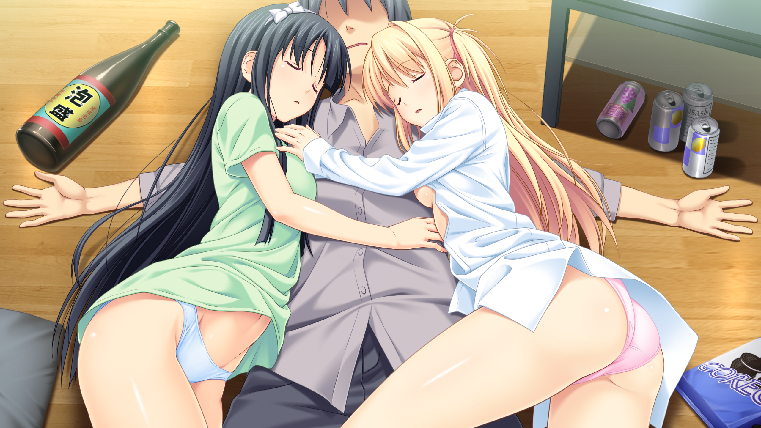 1boy2girlsalcoholassbeer canblack hairblonde hairblushbottlebowbreastsclosed eyesdress shirtdrinkingdrunkfacelessfaceless maleFlag for Deletiongirl sandwichgreen shirthairbandhairbowlyingmedium breastsmultiple girlsno brano pantson sideopen mouthpantiespassed outsake bottlesandwichedshaded faceshirtt-shirttwo side upunconsciousunderwearwhite shirt