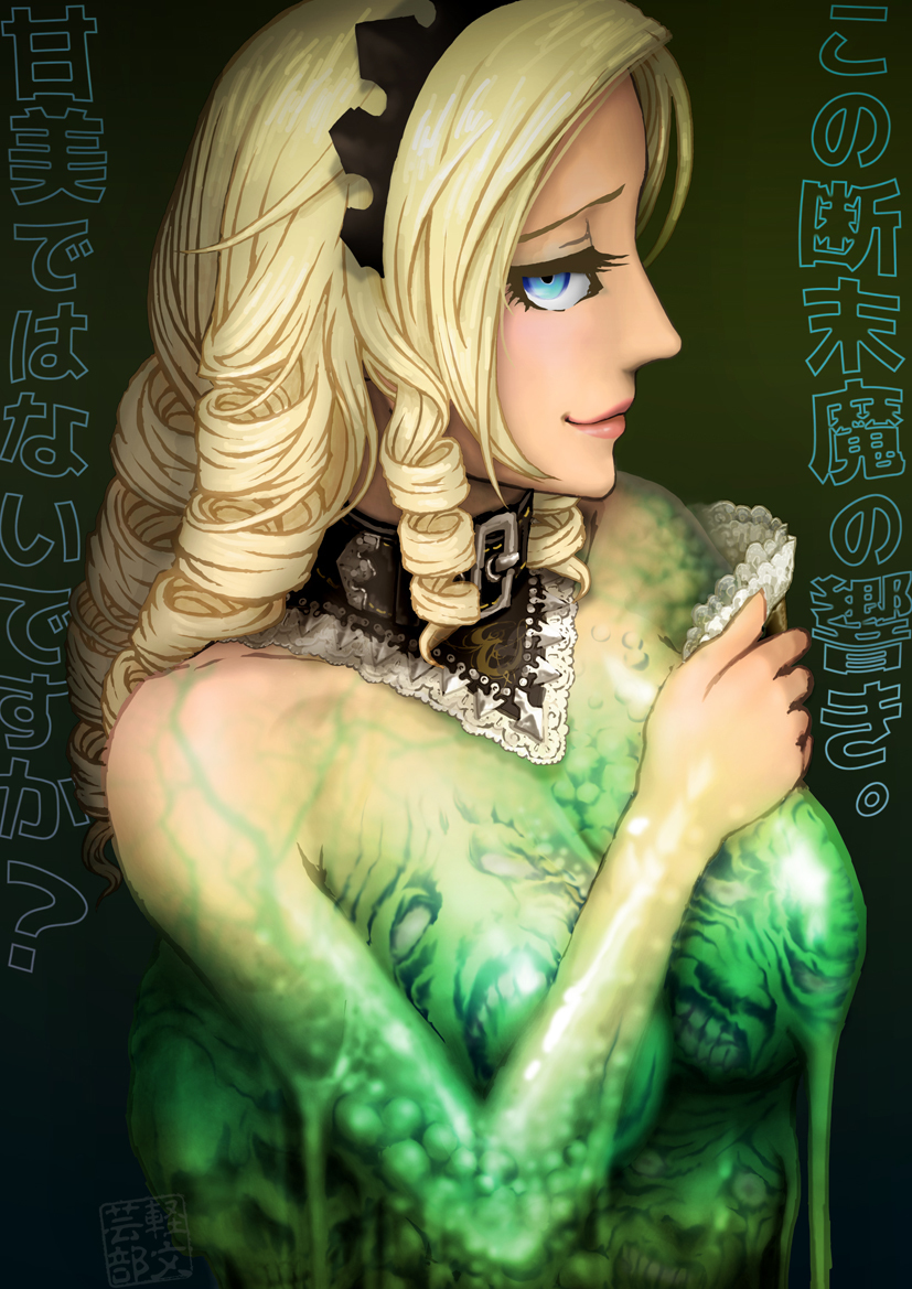 blonde hairblue eyesbreastscollarfemalefemale onlyFlag for Deletionfrillslarge breastsmaidmaid headdressslimesolo