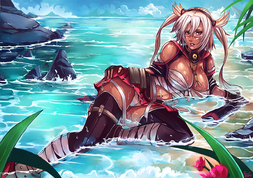 ammunitionbandagesblack glovesblack legwearblonde hairblushbreastsbudget sarashidark skindark-skinned femalefemalefingerless glovesFlag for Deletionglassesglovesheadgearlong hairlyingnavelnippleson sideoutdoorspantiespantyshotpantyshot (lying)parted lipsred eyesrimless glassessarashisee throughsolothighhighstied hairtwintailsunderwearwaterwet