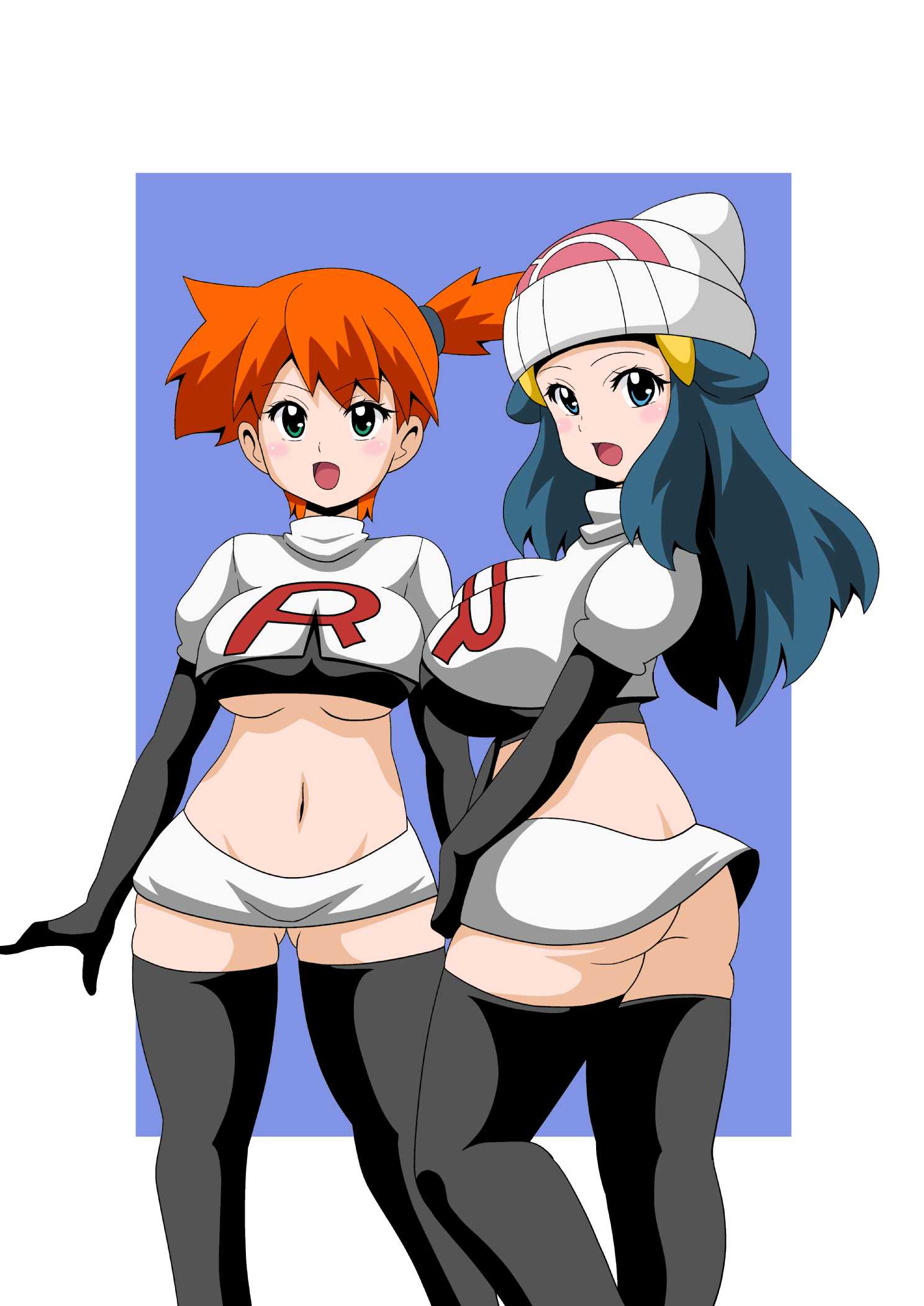 2girlsassblue eyesblue hairblushbreastsbutt crackcleavageclothesfemalefemale onlyFlag for Deletiongreen eyeshairhatheadgearhumanhuman onlyhumans of pokemonlarge breastslong hairlooking at viewerlooking backmultiple femalesmultiple girlsnavelopen mouthorange hairpokemonshort hairsmilestandingunderboob