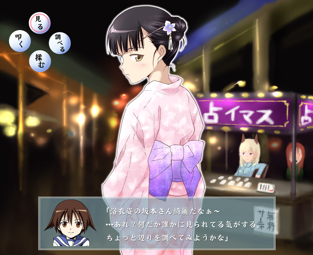 3girlsalternate costumeanimal earsblack hairblue eyesblushbrown eyesbrown haireyepatchfake screenshotfestivaljapanese clotheskimonolong hairlooking backmultiple girlsparodyred hairvisual novelyukata