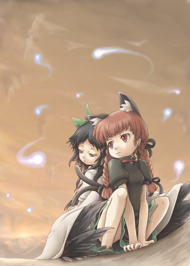 2girlsanimal earsarm supportback-to-backblack hairbowbraidcat earscat girlcat tailfemale focushair bowhair ribbonhitodamalong hairmultiple girlsmultiple tailsred eyesred hairribbonshort hairskysleepysquattingtailtwin braidstwintailswings