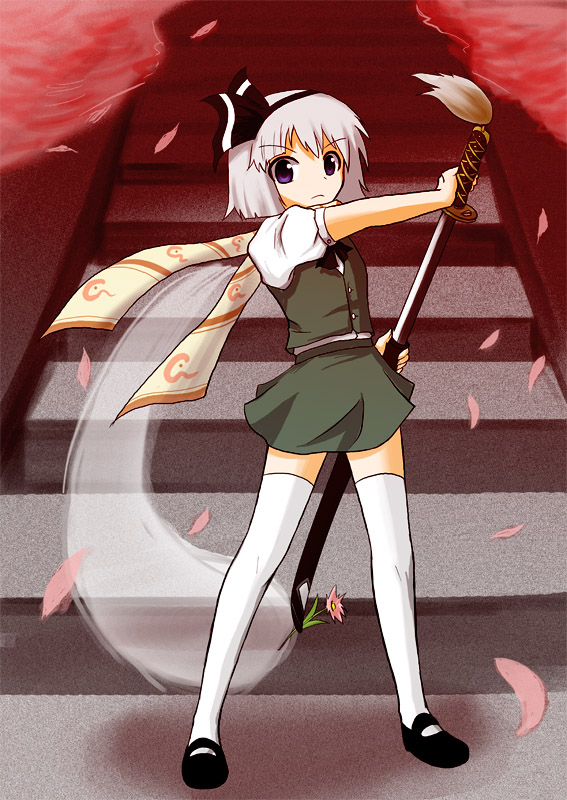 shiroi noria, nagi, kannagi, 00s, blue hair, blunt bangs, boots, crossed legs, hairband, long hair, mouth hold, purple eyes, ribbon, shoes, single shoe, sitting, solo, strap slip