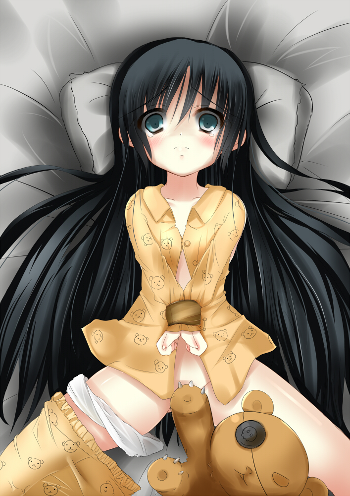 1girlanimal printbdsmbear printbedblack hairblushbondageboundcensoredconvenient censoringfemale focuslolilong hairlyingno pantiespajamaspantiespanties around legpants around one legprint pajamassolostuffed animalstuffed toytapetape bondageteddy bearunderwear