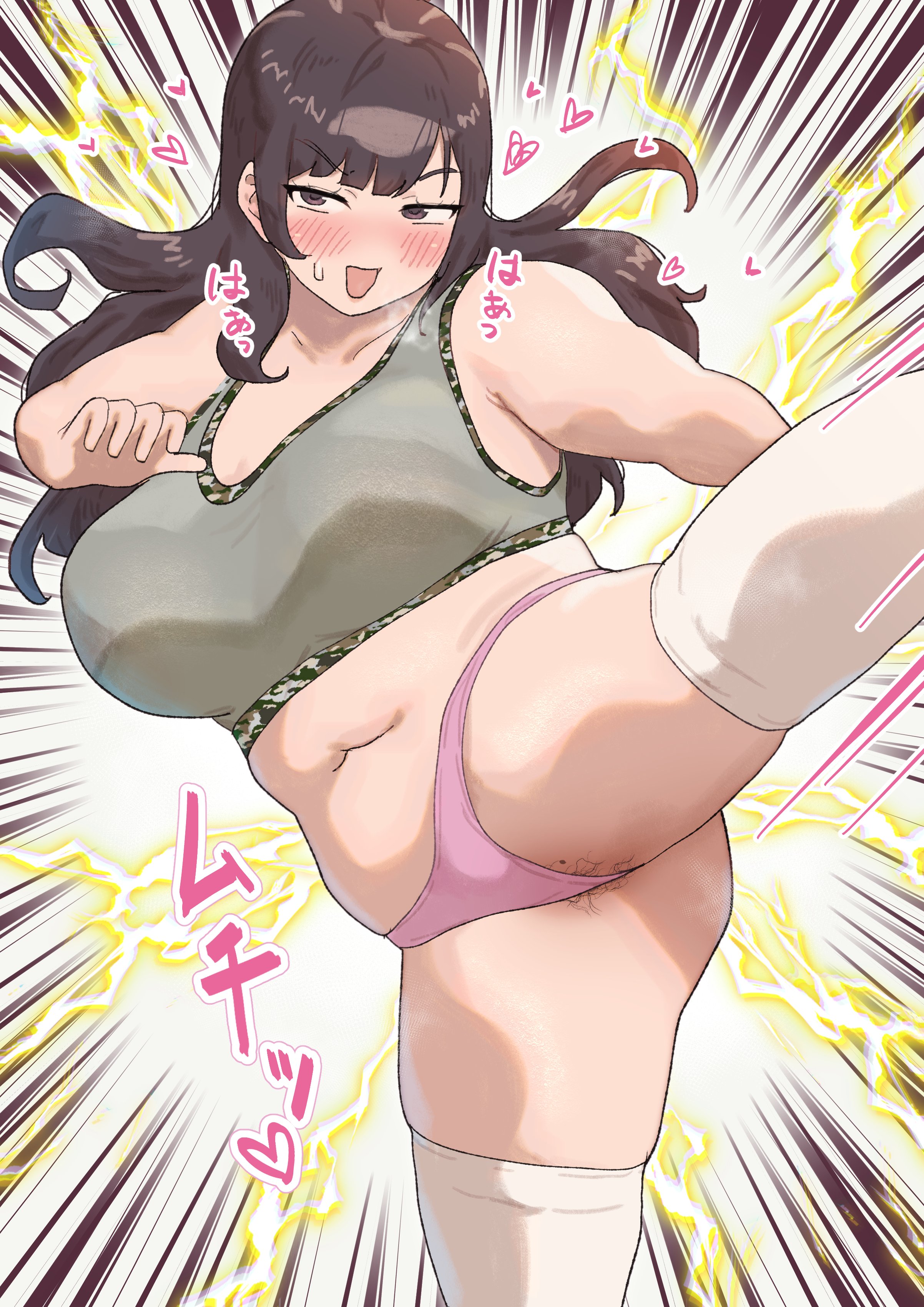 1girlbellyblack eyesblack hairblushbreastselectricityfemale pubic hairgrey sports braheartkickinglarge breastsleg uplong hairmolemole on thighmotion linesnavelopen mouthpantiespink pantiesplumppubic hairpubic hair peeksmilesolosound effectssports brathighhighsunderwearwhite thighhighs