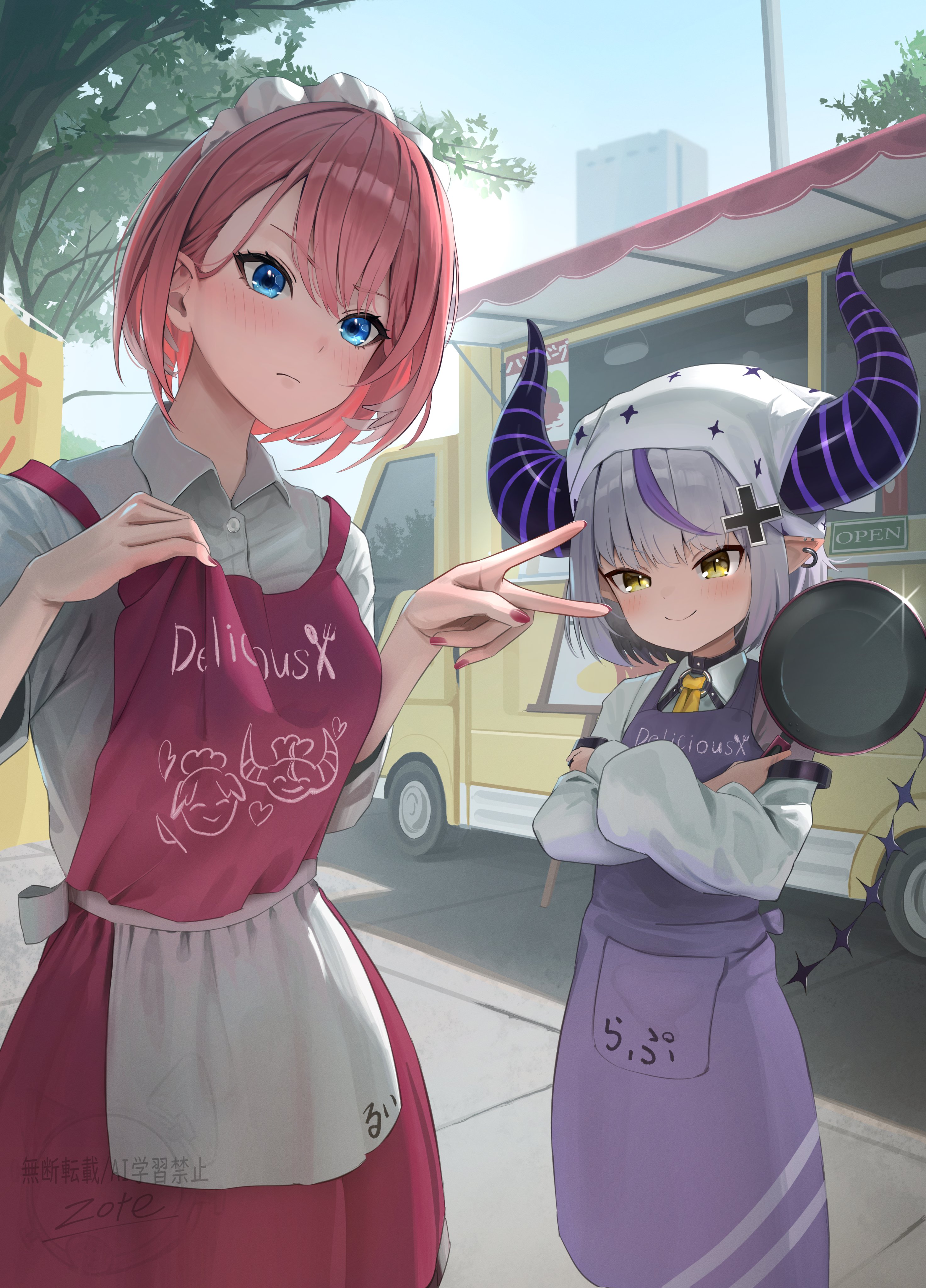 2girlsapronartist nameblack hornsblue eyesblushclosed mouthclothes writingcross hair ornamentcrossed armsdaydemon girldemon hornsdemon taildetached sleevesdress shirtear piercingfood truckfrying pangrey hairhair ornamentheadscarfhornslooking at viewermaid headdressmulticolored hairmultiple girlsnose blusho-ringoutdoorspiercingpink apronpink hairpointy earspurple apronpurple hairpurple hornsred nailsshirtsmugstreaked hairstriped hornstailvv-shaped eyebrowsvirtual youtuberwhite apronwhite sleevesyellow eyes