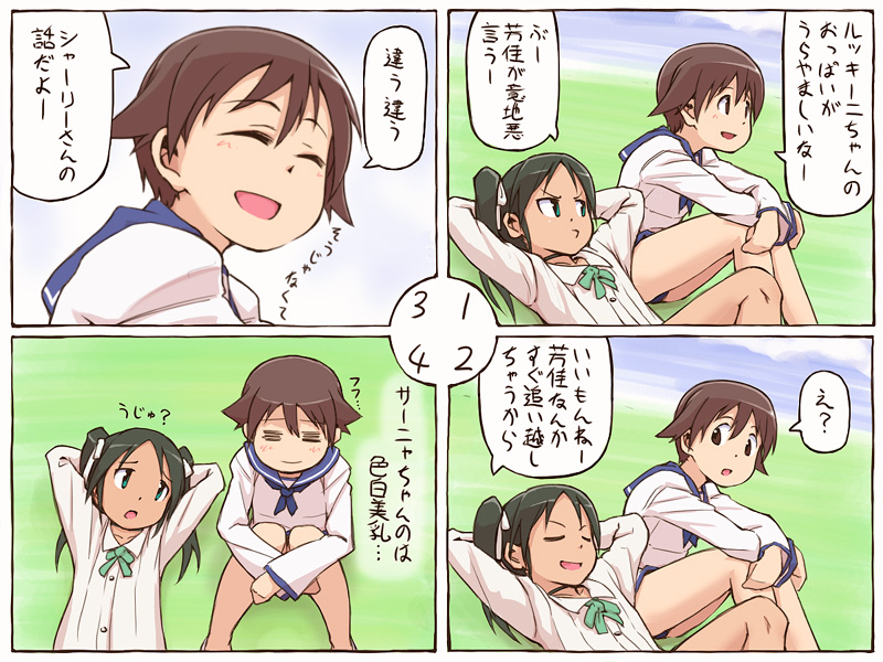kamakurako, kyukkyu-kun, kyukyu-kun, madotsuki, monoe, monoko, poniko, takofuusen, toriningen, yume nikki, absurdres, highres, long image, tall image, translated, 6+girls, braid, comic, diary, hugging object, instrument, kyukkyu kun, multiple girls, music, pillow, pillow hug, pink shoes, playing flute, playing instrument, raised eyebrows, shoes, skirt, sleeping, smile, speech bubble, tako fusen, tears, thought bubble, twin braids