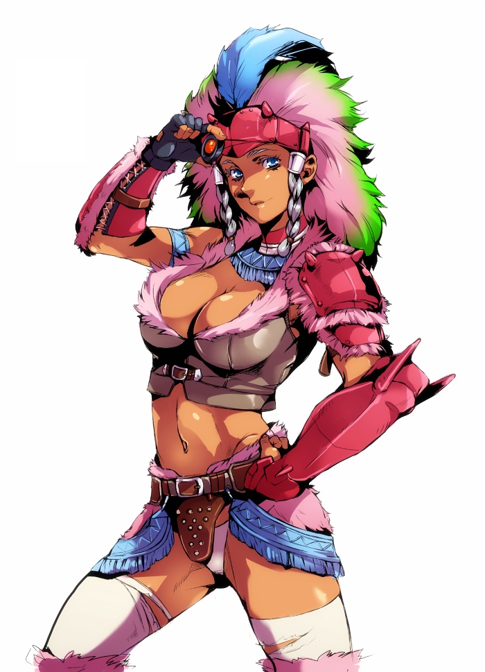 1girlarmbandarmorbeltbraidbreastscleavageconga (armor)feathersfemale focusfingerless glovesgloveshair tubeshand on own hipheaddresslarge breastsmidriffpantiessimple backgroundsolotanthighhighstorn clothestwin braidsunderwear