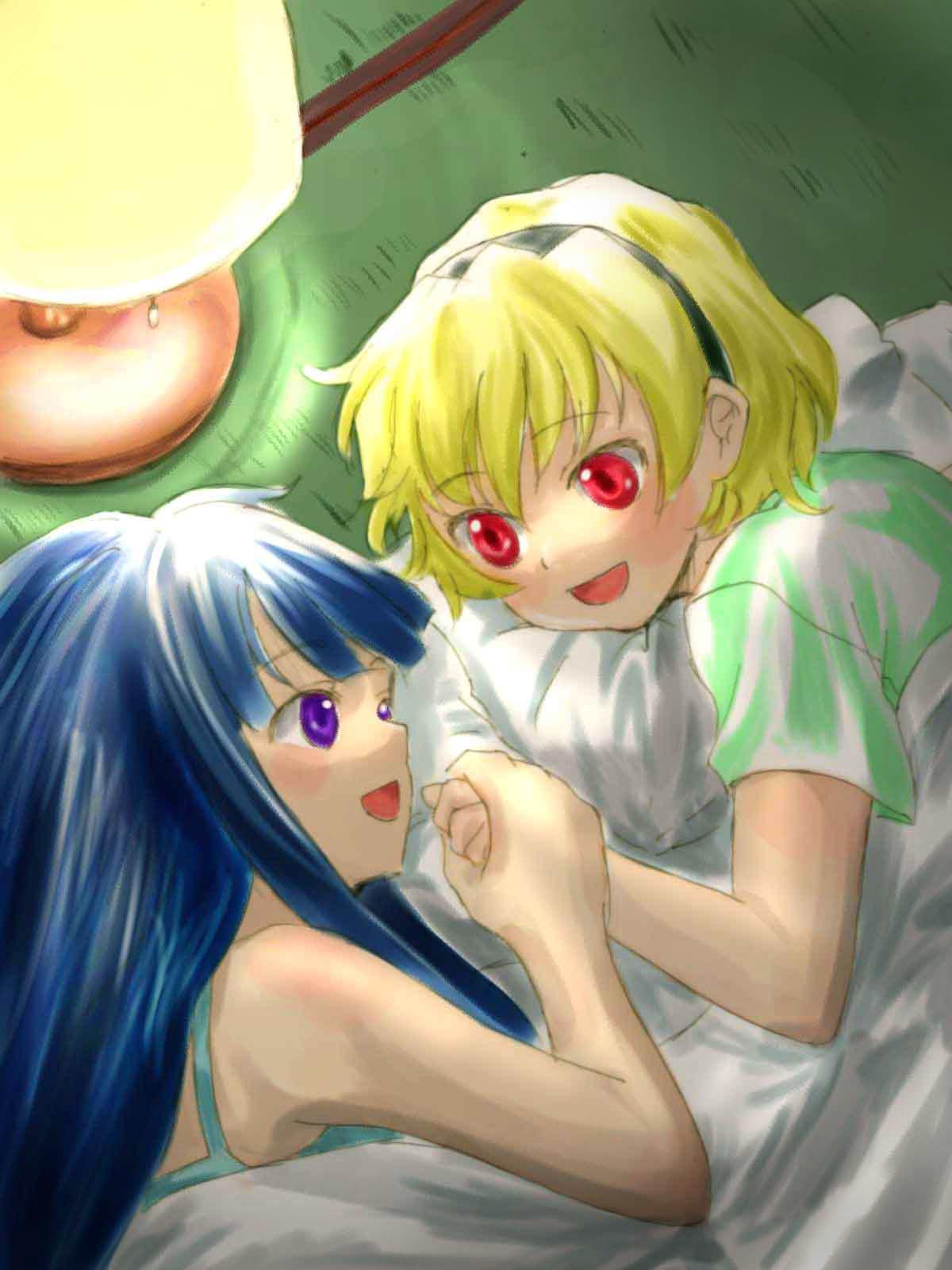 00s2girlsbare shouldersbedblonde hairblue hairblunt bangshairbandhappyhime cutholding handslamplong hairmultiple girlsopen mouthpurple eyesred eyesshort hairtatamiyuri