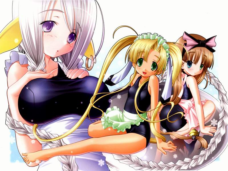 3girlsapronbarefootblonde hairbraidbrown hairfeetgreen eyesheterochromialong hairmultiple girlsone-piece swimsuitpurple eyesschool swimsuitswimsuittwintails