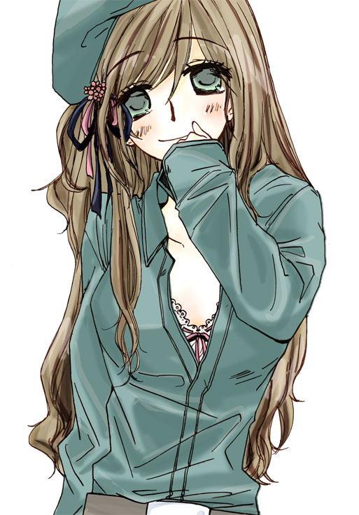 00s1girlbeltberetbrabrown haircamisolefemale focusgreen eyeshair ribbonhatlong hairmilitarymilitary uniformribbonsmilesolounderwearwhite background