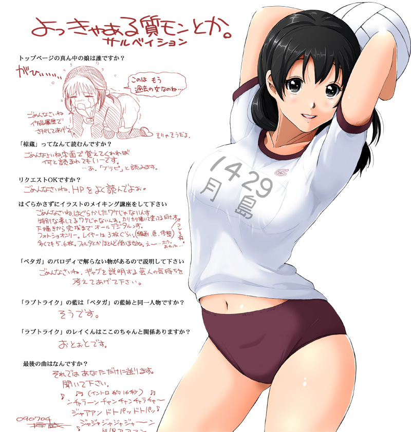 1girlarms behind backarms behind headarms upballblack eyesblack hairburumaclothes writingfemale focuslong hairnavelshirtsimple backgroundsmilesolot-shirtvolleyballvolleyball (object)