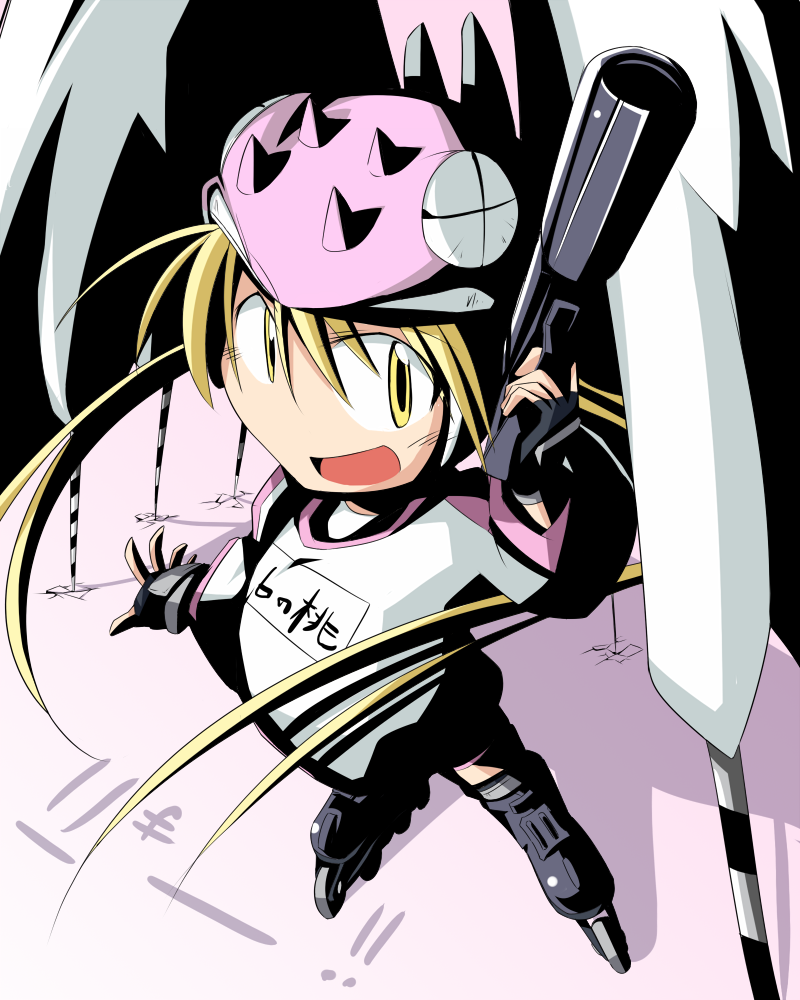 1girlalienblonde hairfingerless glovesglovesguninline skatesknee padsleft-handedroller skatesskatestwintailsweaponwingsyellow eyes