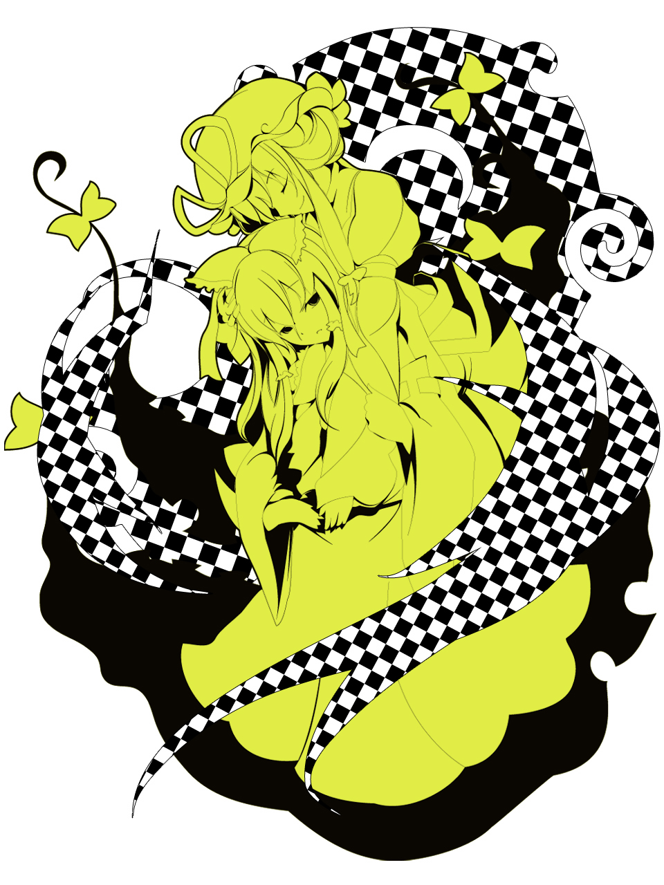 2girlsbowclosed eyesdetached sleevesfemale focushair bowhathugjapanese clothesmikomonochromemultiple girlsyellow theme