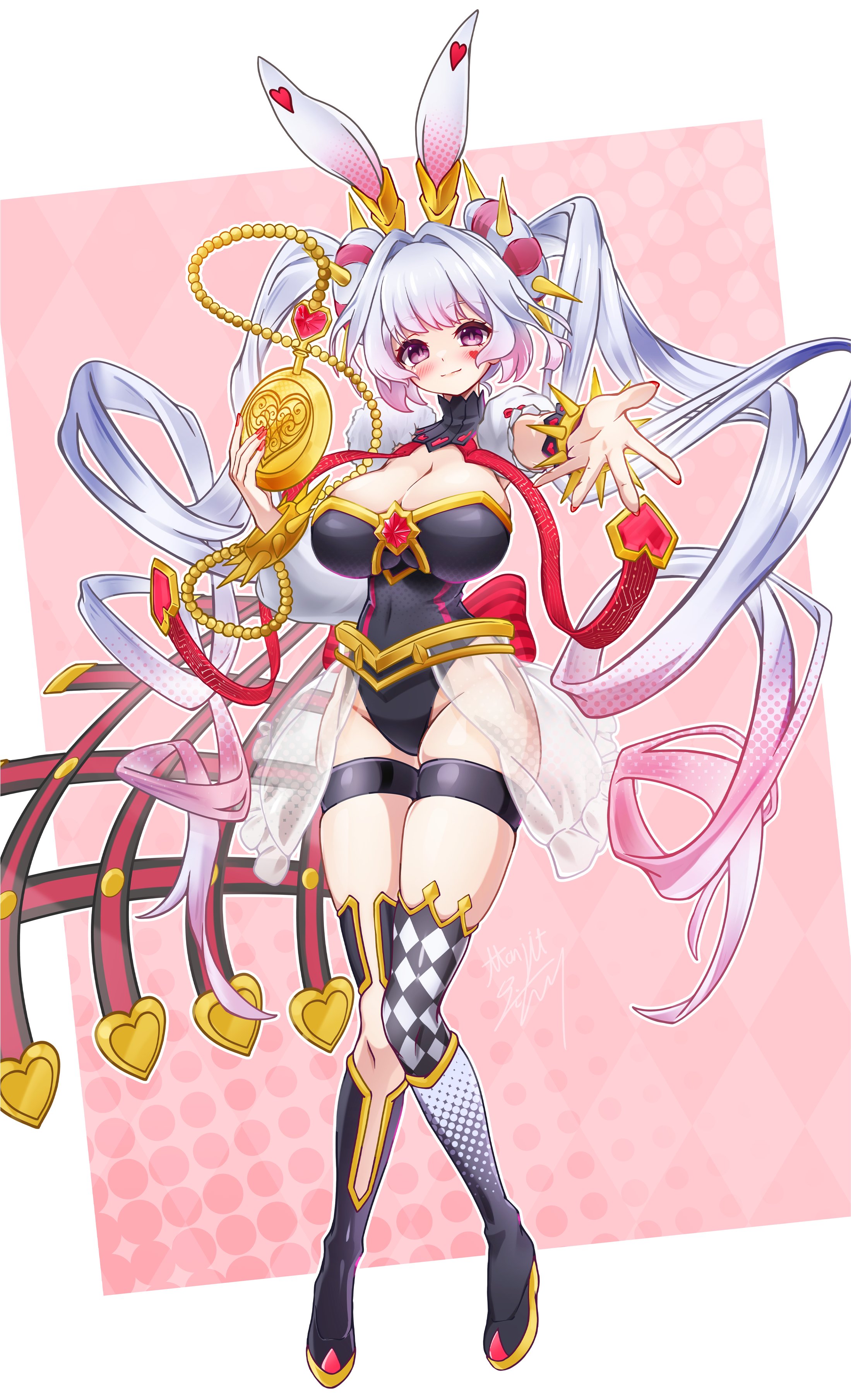 1girlanimal earsasymmetrical bangsasymmetrical clothesblack leotardblushbreastscleavageclosed mouthdouble bunduel monsterfull bodygradient hairhair bunhair ornamentholdingholding pocket watchlarge breastsleotardlong sleeveslooking at viewerlooking backmulticolored hairmultiple viewspink hairpocket watchrabbit earsrabbit girlreachingreaching towards viewershort sleevessmilespikesthigh straptwintailswatch