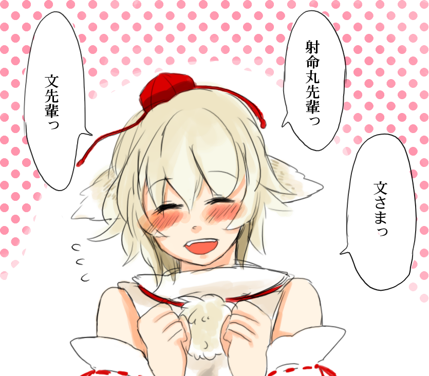 1girlanimal earsblonde hairblushclosed eyesdetached sleevesfemale focushappyhatshort hairsolowhite hairwolf ears