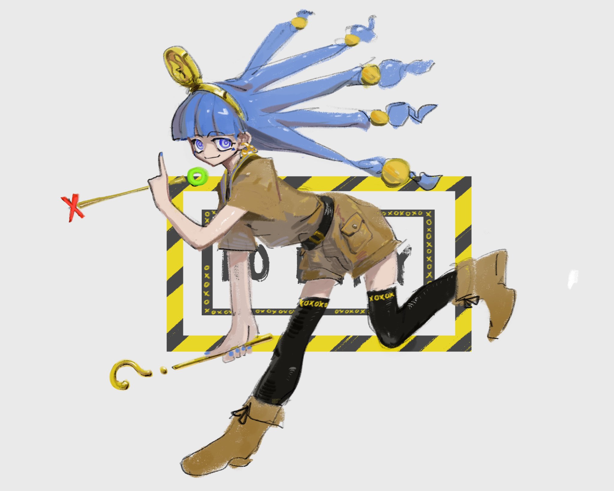 1girlaqua eyesaqua hairblack thighhighsblunt bangsbrown shortsearringsgold headdressjewelrykey earringslong hairlooking at viewershort sleevesshortsthighhighswhite background