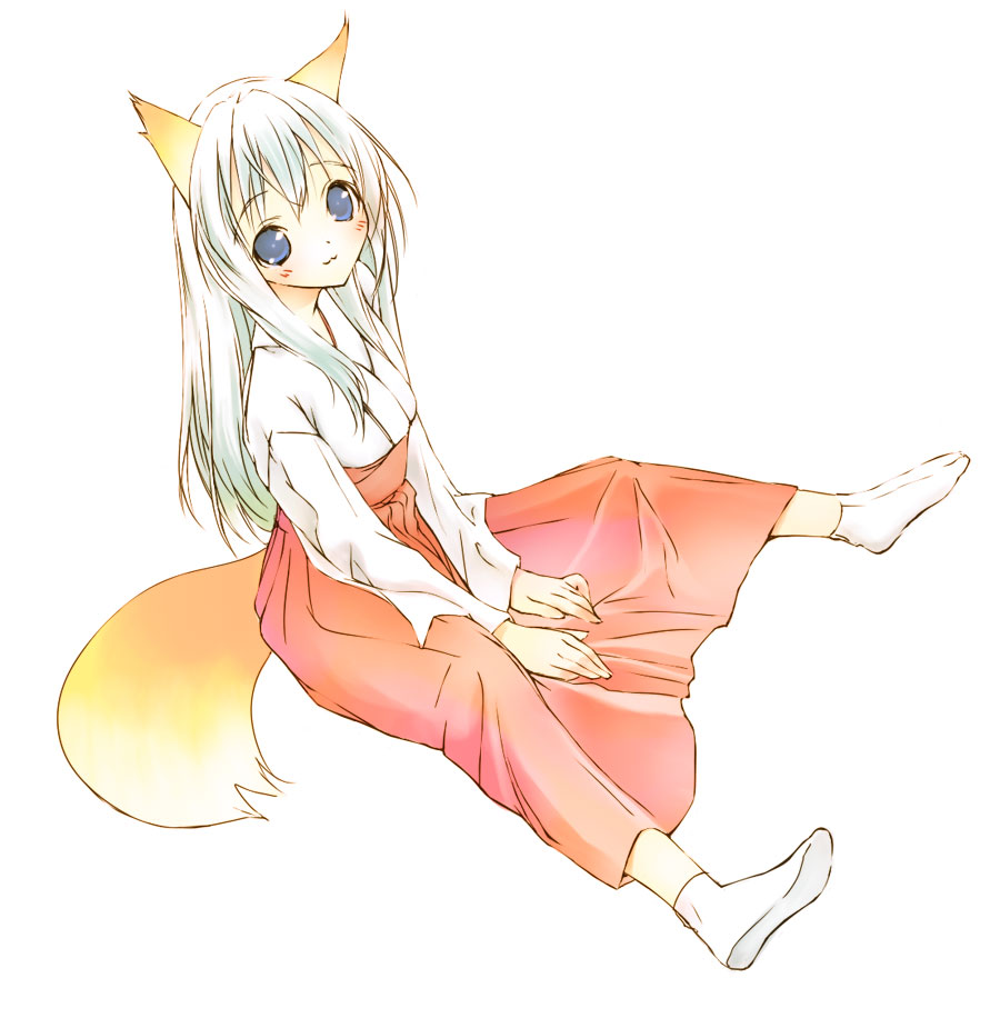 :31girlanimal earsblue eyesblushfemale focusfox earsfull bodyjapanese clotheslong hairlong skirtmikosimple backgroundsittingskirtsockssolotabitailwhite background