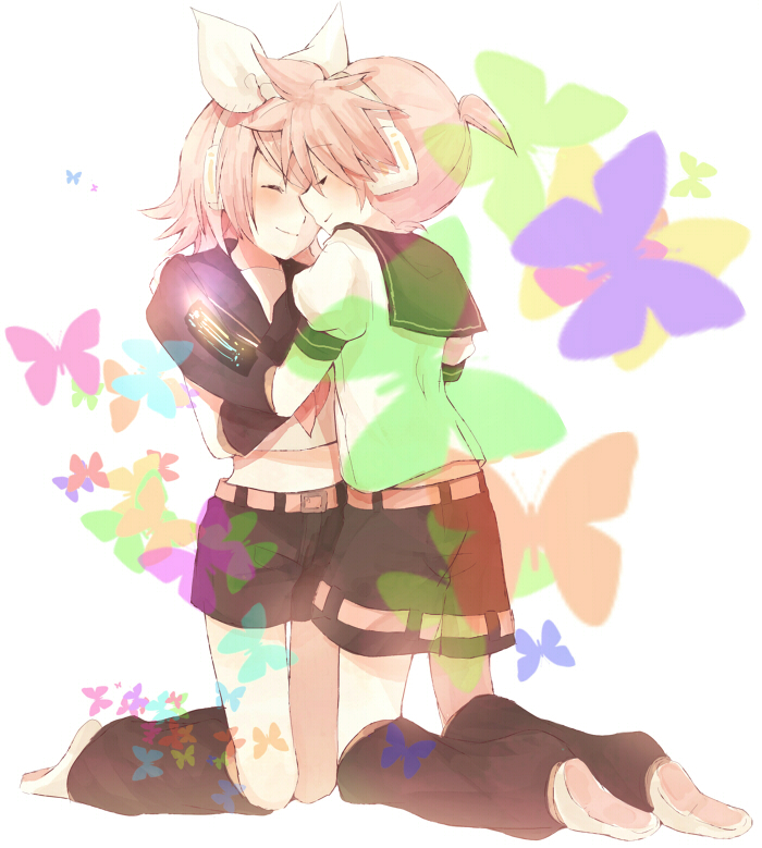 1boy1girlblonde hairbrother and sisterbugbutterflyhair ribbonheterohuginsectkneelingribbonsailor collarshort hairshortssiblingssmiletwins
