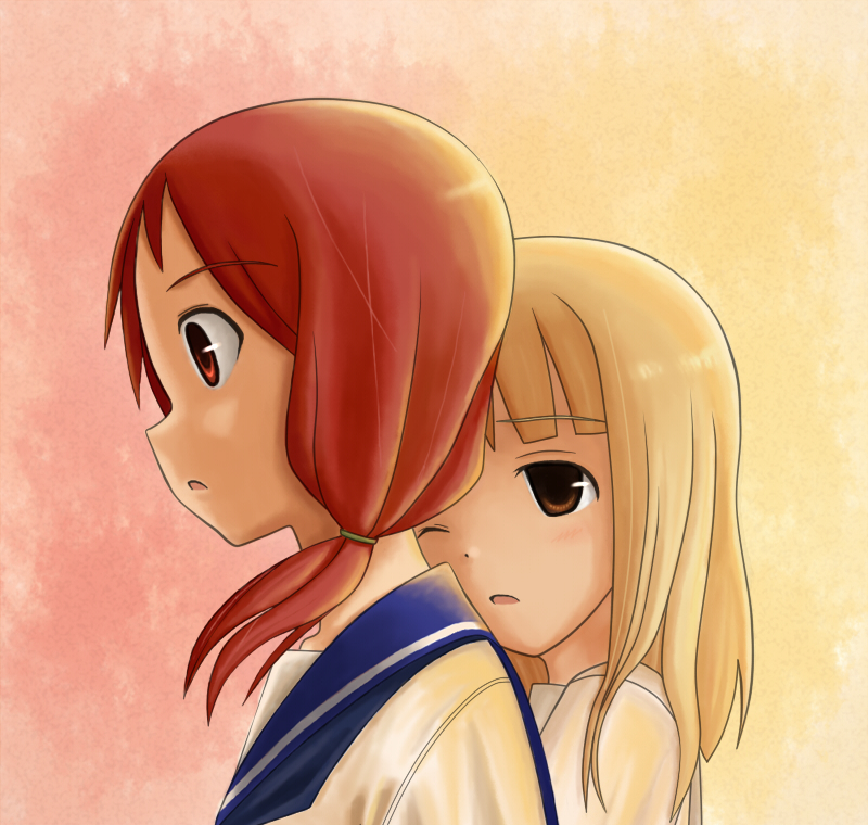 00s2girlsalternate hairstyleblonde hairblushbrown eyesfrom sidehairbandmultiple girlsone eye closedprofilered eyesred hairschool uniformserafukushort hairshort twintailstwintailswink