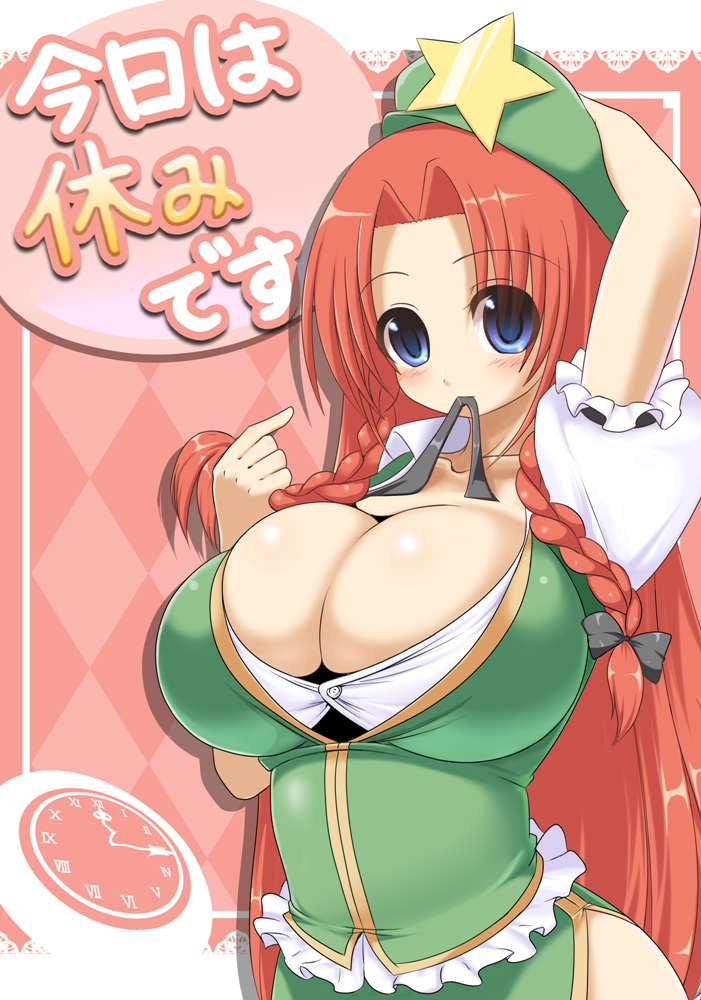 1girlblue eyesbraidbreastsbursting breastschina dresschinese clothescleavagedressfemale focushathuge breastslong hairmouth holdred hairsolotwin braids