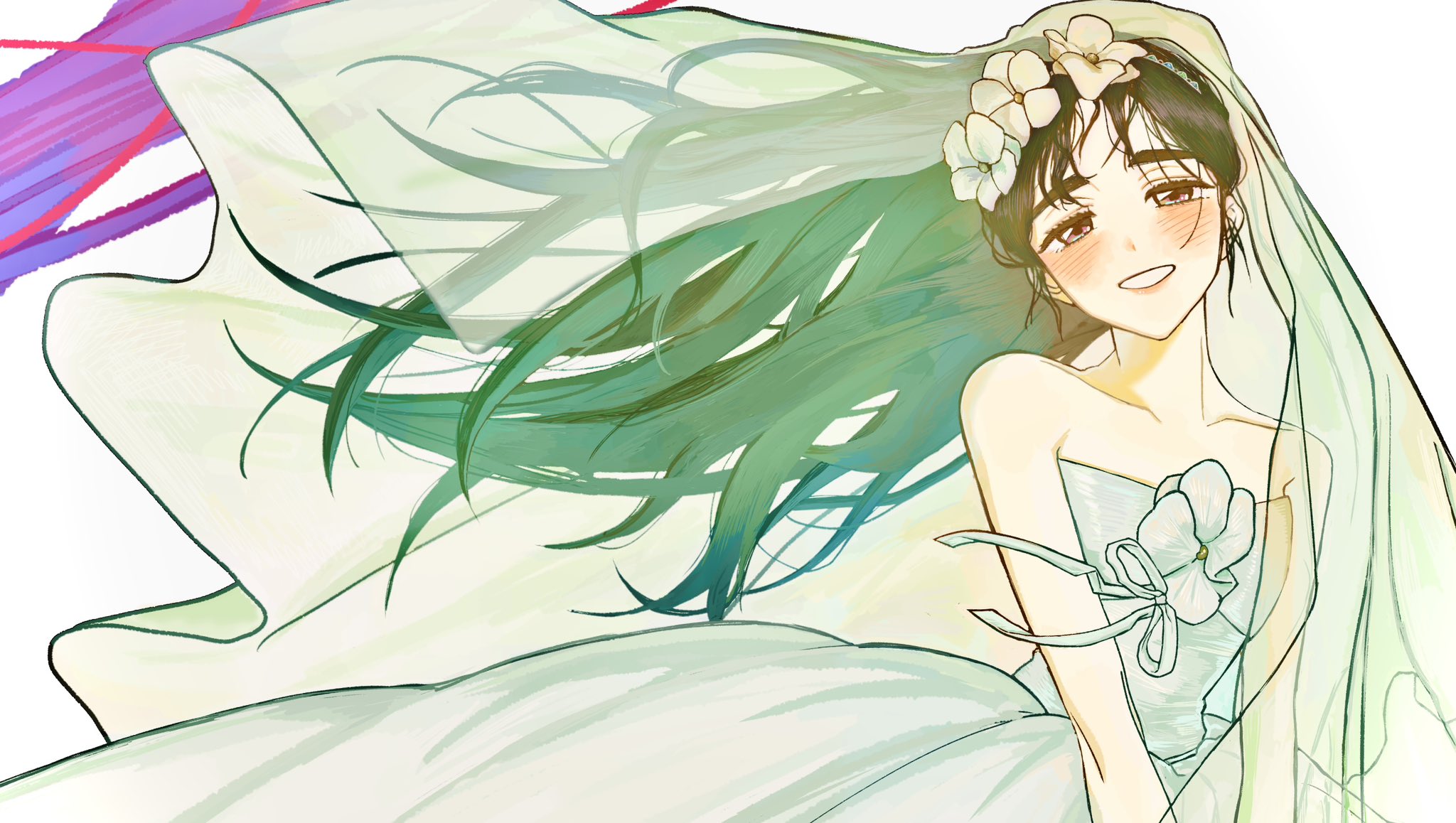 1girlbare shouldersblack hairblushbridal veilcollarbonedressdress flowerfloating hairflowerhair flowerhair ornamentlong hairofficial alternate costumeofficial alternate hair lengthofficial alternate hairstylepurple eyessmilesnsbeginner4649straplessstrapless dressveilvery long hairwedding dresswhite dresswhite flower