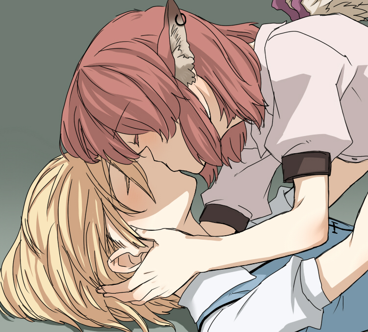 2girlsalternate costumeanimal earsclosed eyescontemporarycoupleearringsfemale focusjewelrykisslyingmultiple girlssimple backgroundyuri