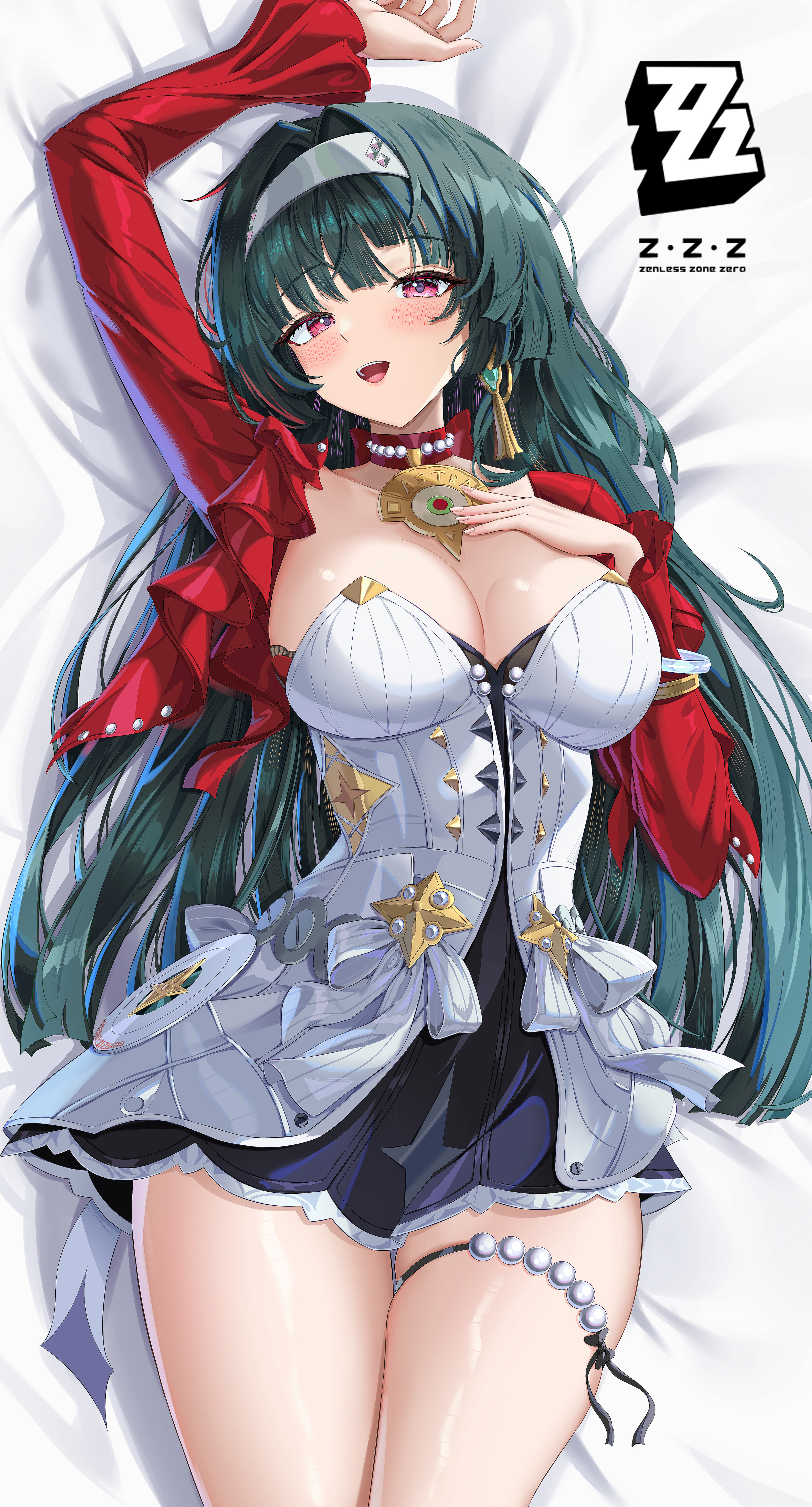 1girlblack hairbreastscleavagecopyright logodakimakura (medium)dressearringshairbandjacketjewelrylarge breastslogolong hairlooking at viewerlyingnecklaceon backon bedopen mouthpearl necklacepurple eyesred jacketsolothigh strapthighsvery long hairwhite dresswhite hairband