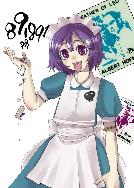 albert hofmanndroolingdruggeddrugslsdmaidpillpurple eyespurple hairsalivashort hairsolotonguetongue out