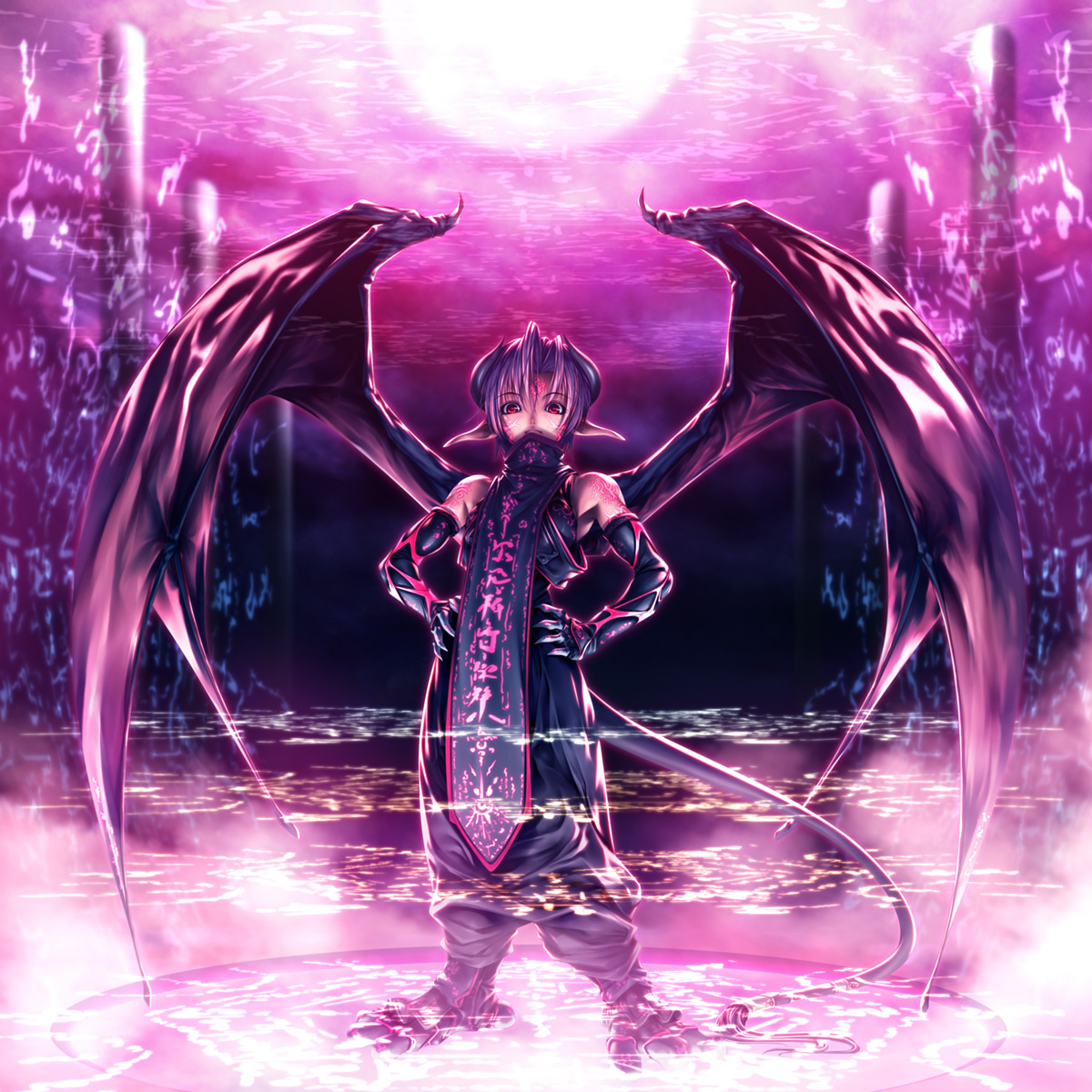 androgynousarmpitsasymmetrical bangsdemonfull bodyfull moonhands on own hipshornsmoonpointy earspurple hairpurple themered eyessolostandingtabardwings