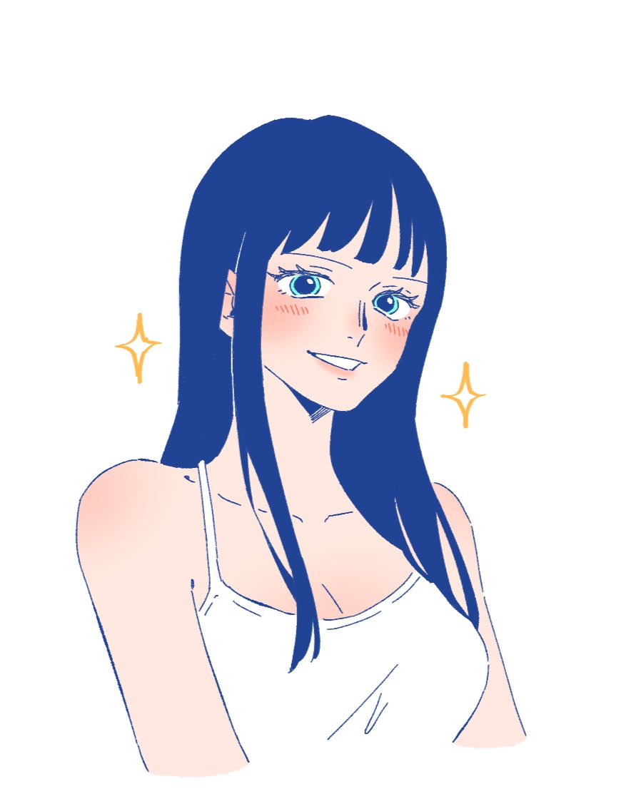 1girlblue eyesblunt bangsblushcamisoleeyelasheslong hairsimple backgroundsmilesolosparkleupper bodywhite backgroundwhite camisole