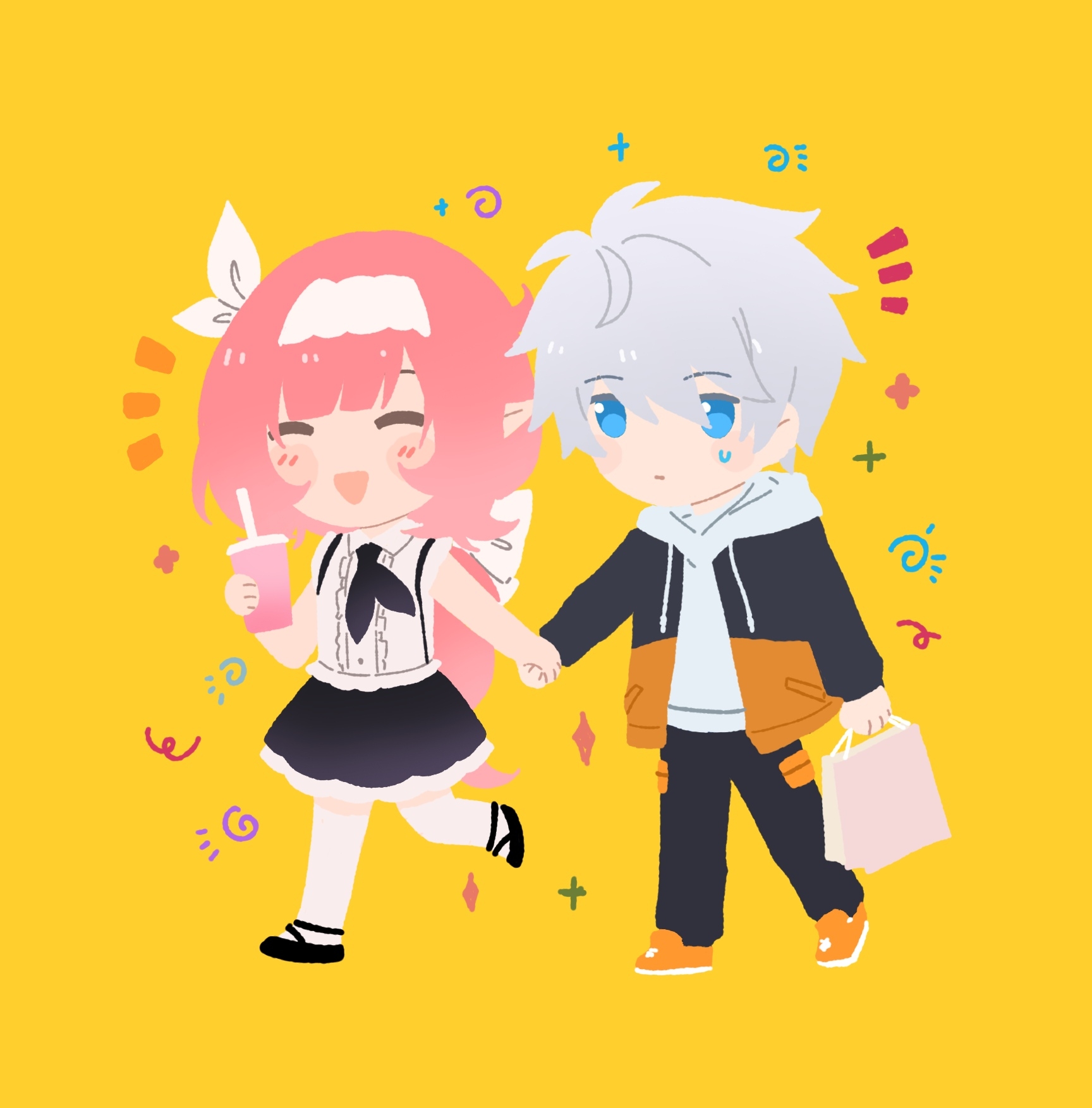 ahogebagblack jacketblack pantsblack shoesblue eyesblue skirtblush stickerscupdisposable cupelfgift arthairbandholdingholding bagholding cupholding handsjacketlong hairmulticolored jacketorange jacketorange shoespantspink hairpointy earsshirtshoesshort hairskirtsmilethighhighstwo-tone jacketvery long hairwhite hairbandwhite shirtwhite thighhighsyellow background