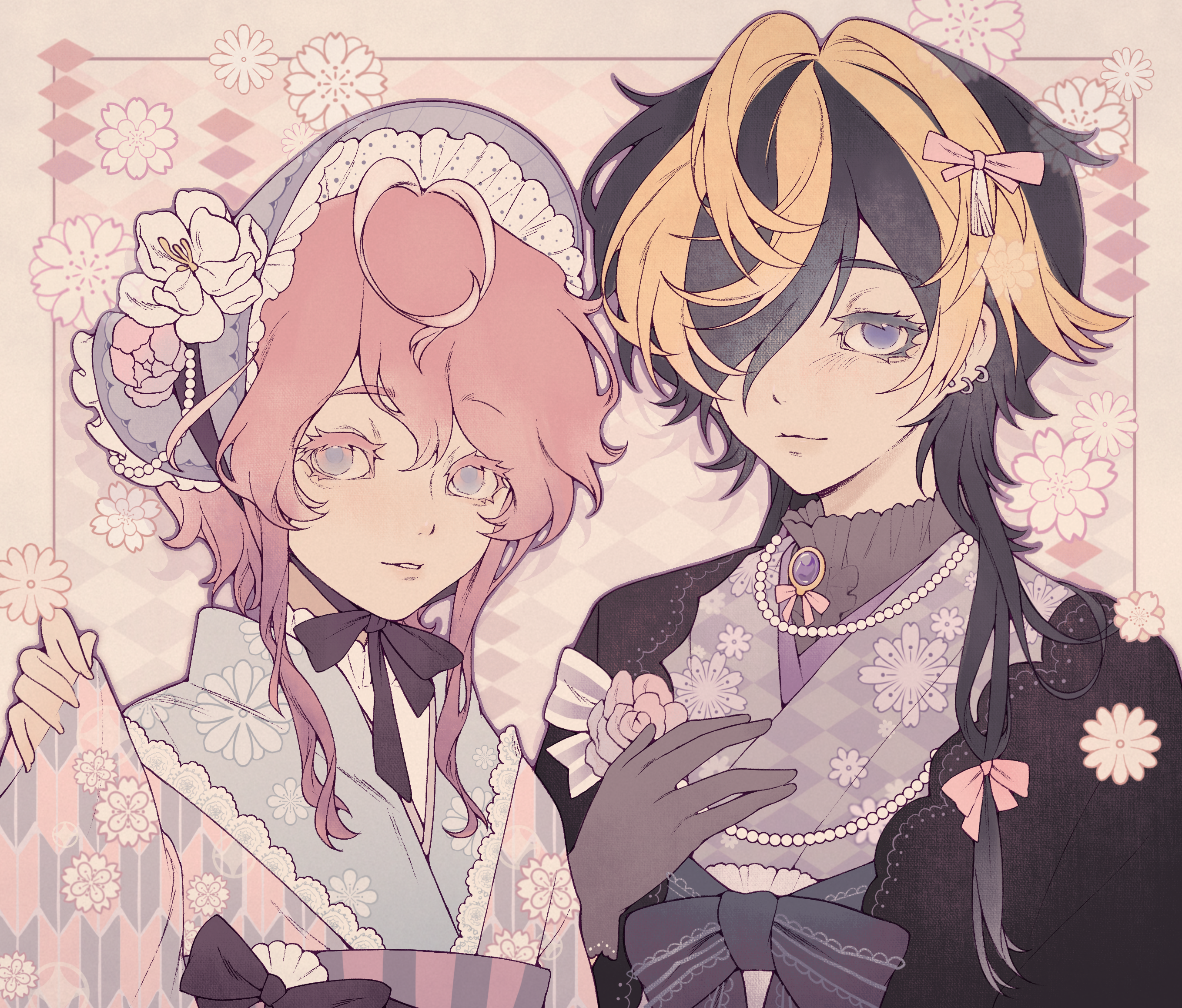 alice elliot, shadow hearts, silver hair, artist request, 1girl, blood, blood splatter, blue bow, blue dress, blue eyes, blush, book, bow, breasts, closed mouth, collar, cross, dress, facing viewer, female focus, frilled dress, frilled sleeves, frills, hair bow, hair bun, hair ornament, hair ribbon, hair tie, hands up, happy, holding, holding book, long sleeves, looking at viewer, medium breasts, multicolored dress, ribbon, simple background, smile, solo, white background