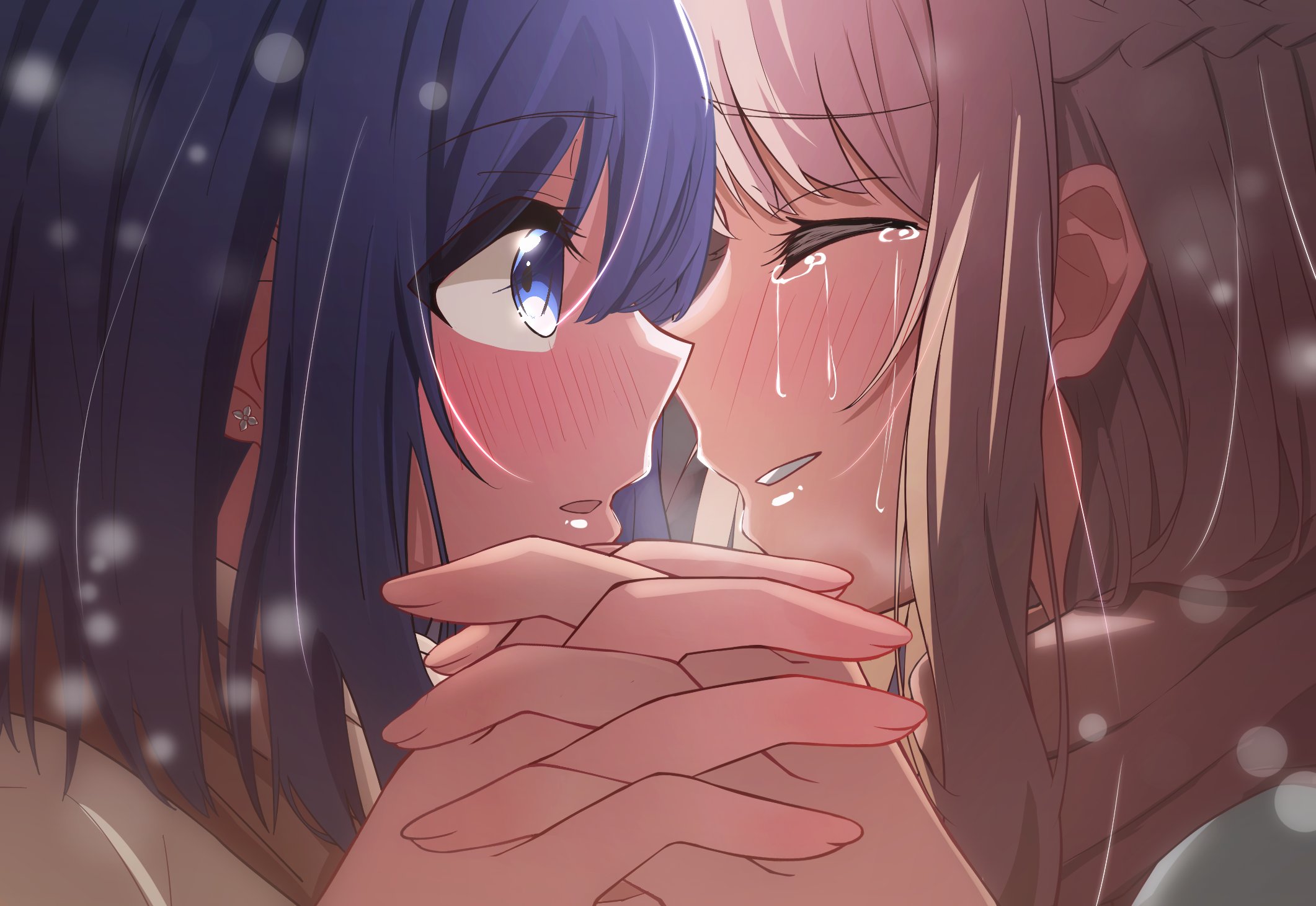 2girlsblue eyesblue hairblushbraidbrown scarfclosed eyeshalf up braidholding handsinterlocked fingerslooking at anothermedium hairmultiple girlsparted lipsscarftearsupper bodyyuri