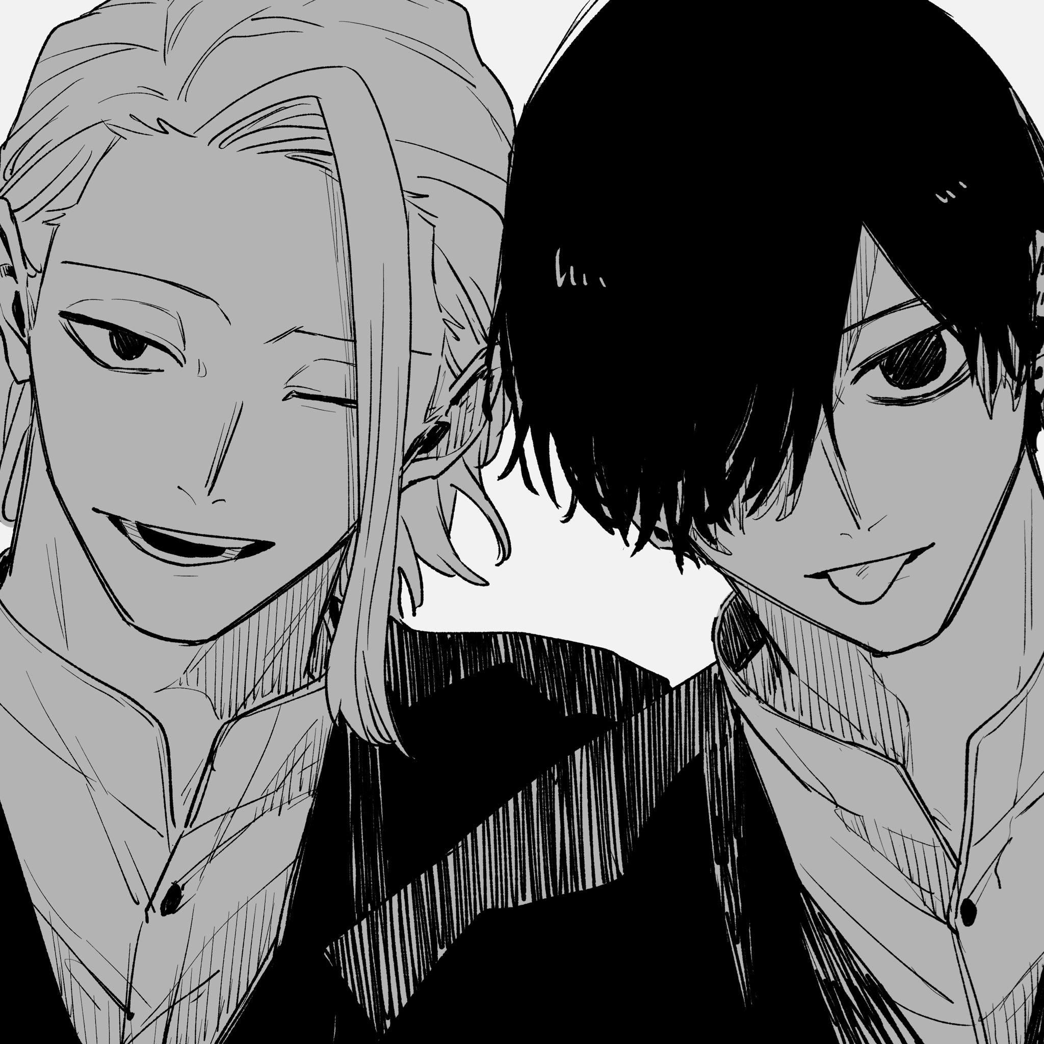 :d:p2boysasymmetrical bangsforeheadgreyscalehair over one eyeheads togetherlong bangsmale focusmonochromemultiple boysone eye closedone eye coveredopen mouthsimple backgroundsmilesweattonguetongue outupper body