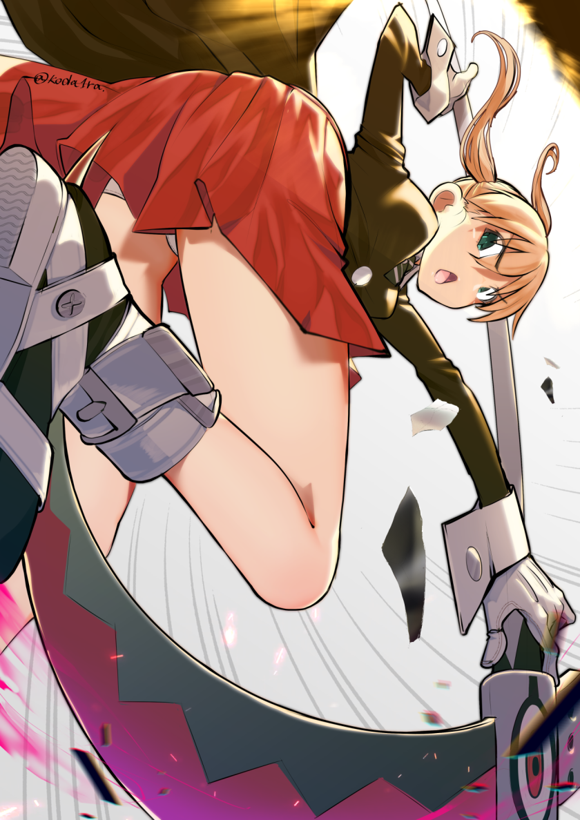 1girlblonde hairbreastsglovesgreen eyesholdinglong hairlong sleeveslooking at viewernecktieopen mouthpantiesschool uniformscytheskirttwintailsunderwearweaponwhite gloveswhite panties