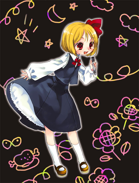 1girlblonde hairfemale focushair ribbonmarkermary janesmicrophonered eyesribbonshoesshort hairsolo