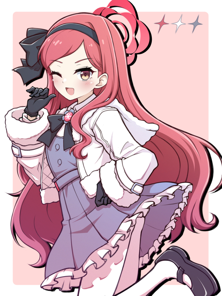 1girlasymmetrical bangsblack bowblack bowtieblack glovesblack hairbandblack shoesborderbowbowtiecolor guidedressfrilled dressfrillsfur trimfur-trimmed jacketfur-trimmed sleevesglovesgrey dresshair bowhairbandhalohand on own hipjacketlong hairlong sleeveslooking at viewermary janesone eye closedopen clothesopen jacketopen mouthpantyhosepink backgroundpleated dressquilted jacketred hairred haloshoessmilesolostandingstanding on one legswept bangswhite borderwhite jacketwhite pantyhoseyellow eyes