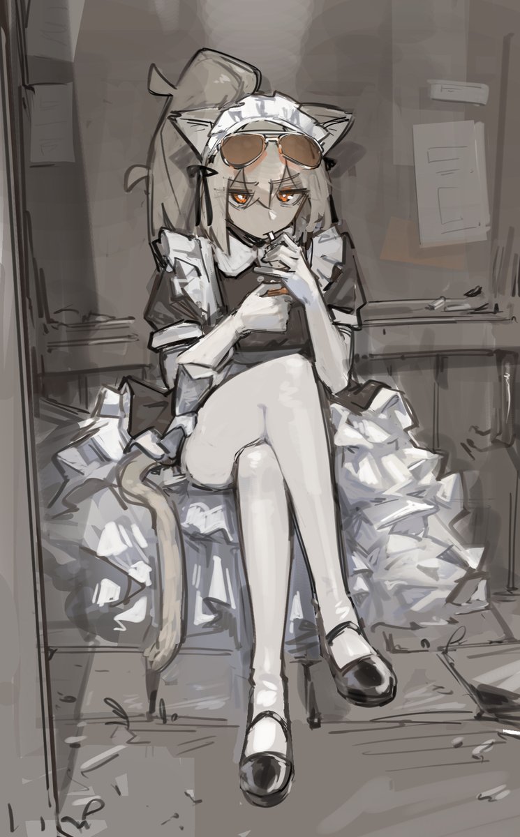 1girlanimal earsaviator sunglassescigarettecolored skincrossed legsdresseyewear on headfrilled dressfrillsfull bodygrey skinholdingholding cigarettelong hairlooking at viewermaidmaid headdressmary janesorange eyespantyhoseponytailpuffy short sleevespuffy sleevesshoesshort sleevessittingsmokingsolosunglassestailtinted eyewearwhite pantyhose