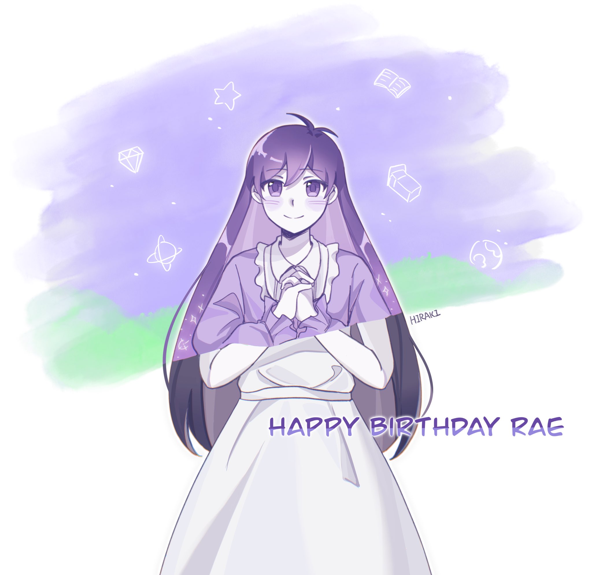 1girlalternate costumealternate universeantenna hairblushcollared shirtcolored skindouble-parted bangshair between eyeshappy birthdayinterlocked fingerslong hairlooking at viewerpurple eyespurple hairshirtsmilesolowhite shirtwhite skin