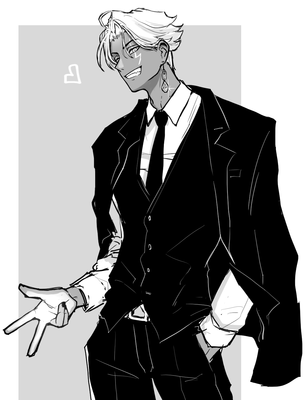 1boybuttonscollared shirtearringsfacial markformal clothesgreyscalegrinhand in pocketheartjacketjewelrylapelslightning bolt facial marklong sleevesmale focusmonochromenecktienotched lapelspantspiercingshirtsmilesolosuitteethvestwing collar