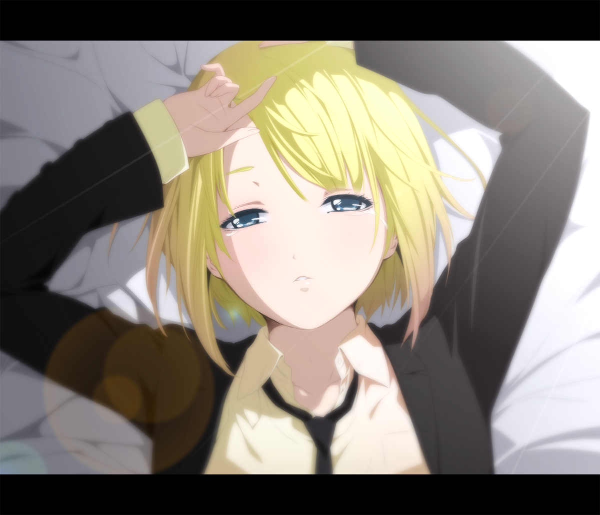 1girlarms upblonde hairblue eyesfemale focusformal clothesgradient hairletterboxedlyingmulticolored hairnecktieon backshort hairsolosuittears