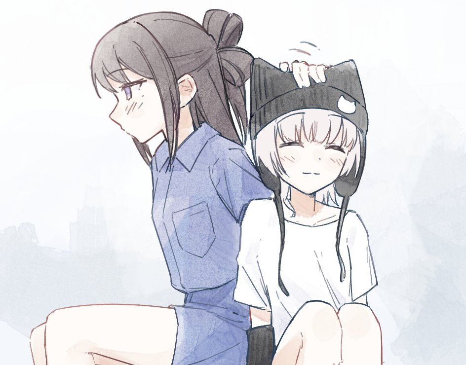2girlsbeanieblack hairblack hatblue shirtblue shortsblushclosed eyesclosed mouthhalf updohatheadpatlong hairmolemole under eyemultiple girlspurple eyesraana the catshirtshort hairshortswhite hairwhite shirt