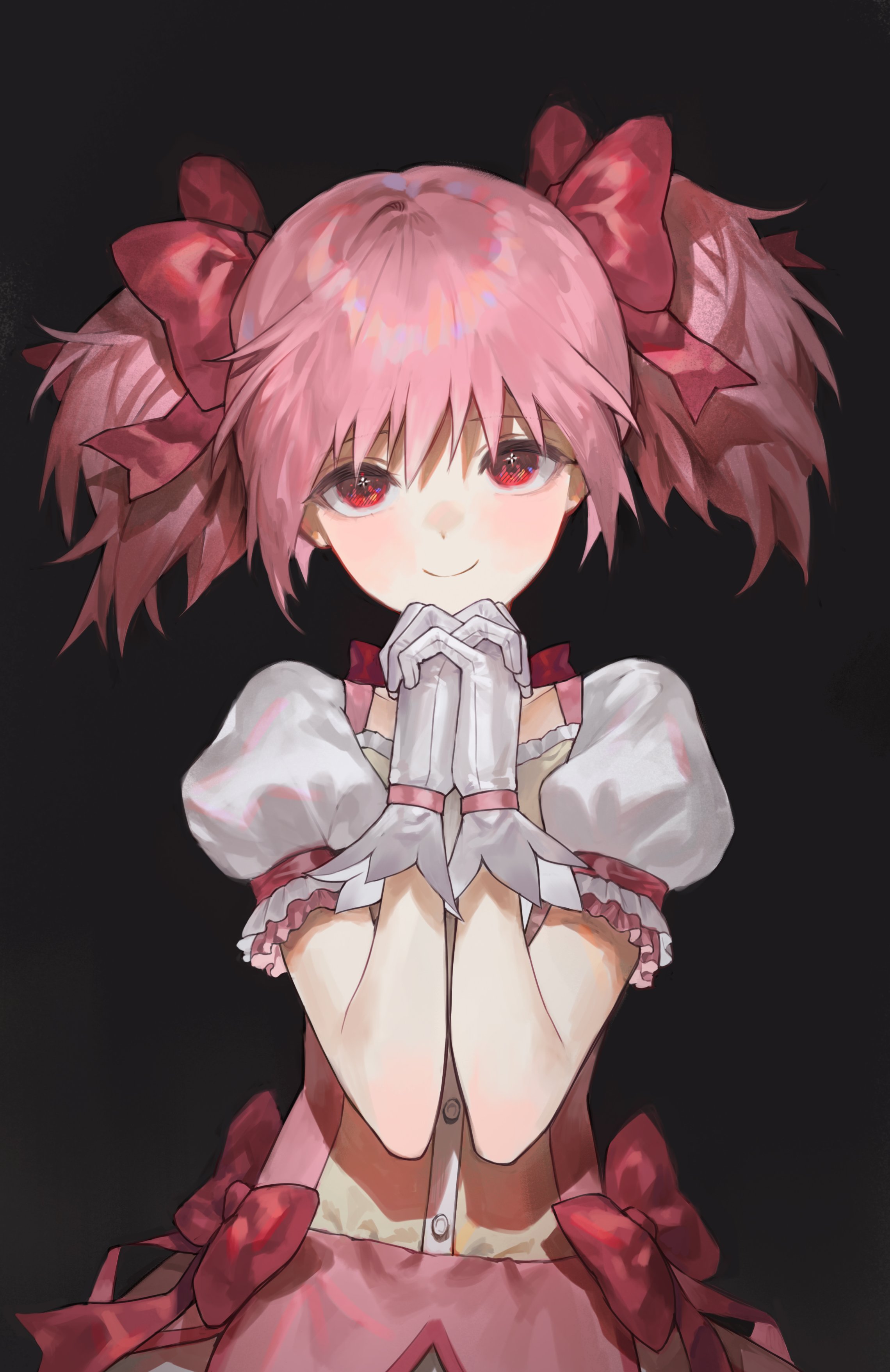 1girlblack backgroundbowbuttonsclosed mouthdressdress bowgloveshair bowlooking at viewermagical girlown hands claspedown hands togetherpink dresspink hairpuffy short sleevespuffy sleevesred bowred eyesshort sleevesshort twintailssimple backgroundsmilesolotwintailsupper bodywhite gloves