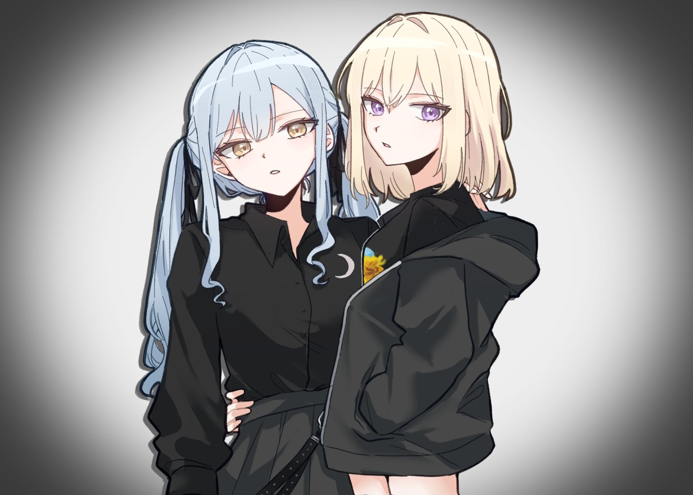 2girlsblack jacketblack ribbonblack shirtblack skirtblonde hairblue hairhair between eyeshair ribbonhoodhooded jacketjacketlong hairlooking at viewermultiple girlsopen clothesopen jacketopen mouthpurple eyesribbonshirtsidelocksskirttwintailsyellow eyes