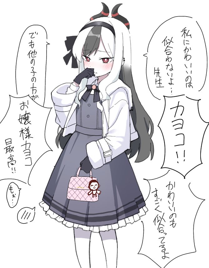 1girlbagblack glovesblack hairblack hairbandblack hornsblushbright pupilscosplaydressfeet out of frameglovesgrey dresshairbandholdingholding baghornsjacketlong hairlong sleeveslooking at anothermulticolored hairpantyhosered eyessimple backgroundsolospeech bubbletakane (blue archive) (cosplay)two-tone hairwhite backgroundwhite hairwhite jacketwhite pantyhosewhite pupils