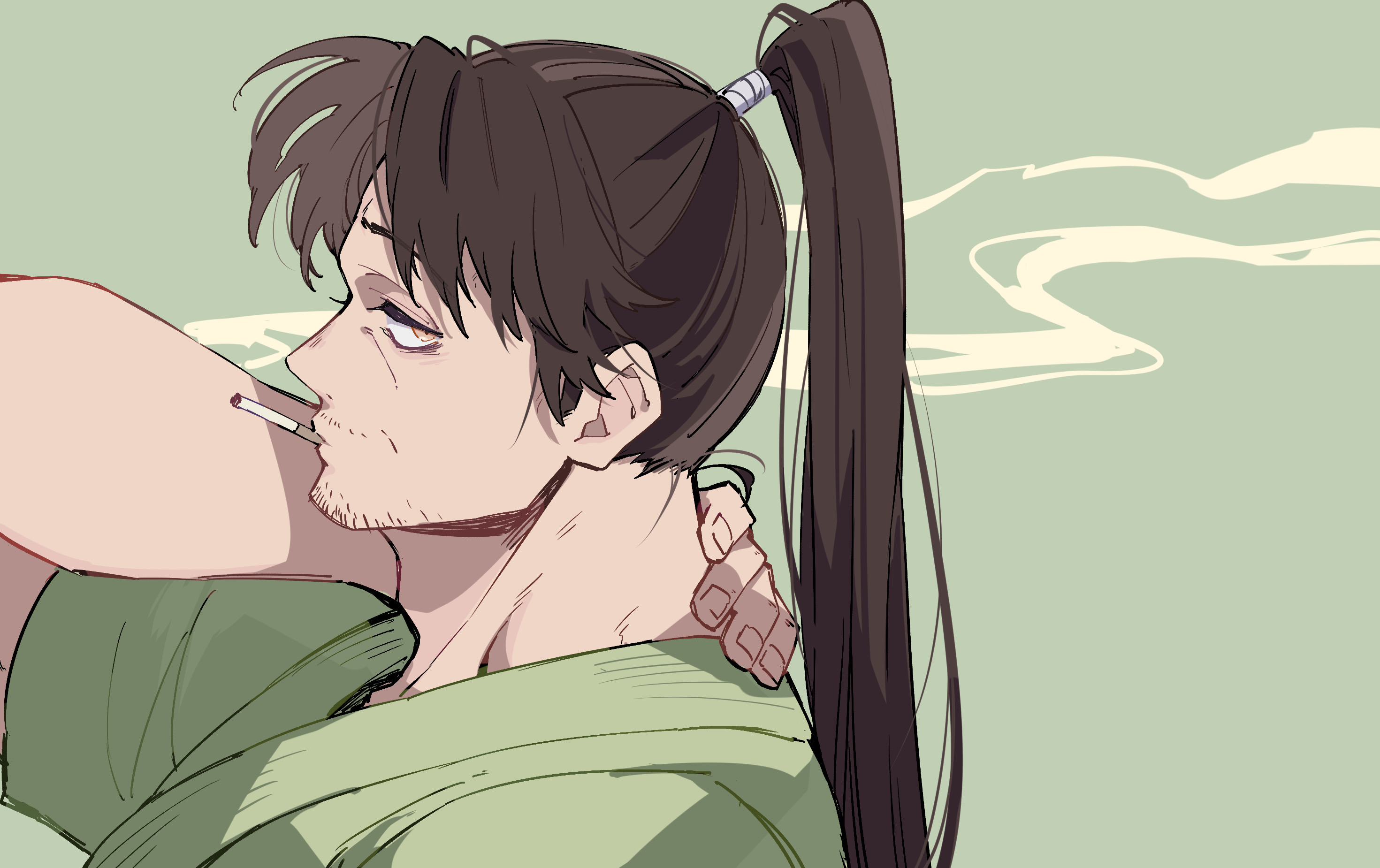 1boyadam's applebags under eyesbrown eyesbrown haircigarettehand on own neckhatsumi senhigh ponytailjapanese clotheslong hairlooking at viewermale focusmature maleponytailprofilesimple backgroundsmokesmokingsolosparse stubbleupper body