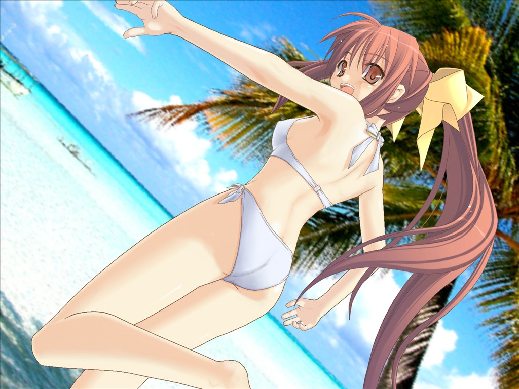1girlassbeachbikinibrown eyesbrown hairdaydutch anglefemale focuslong hairlooking backnatureoutdoorsphoto backgroundponytailskysoloswimsuitwhite bikini